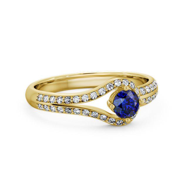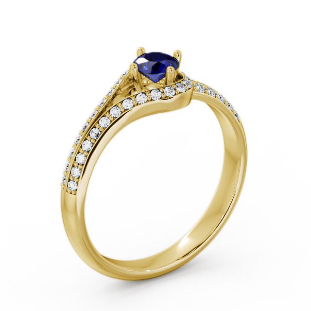 Arriana open halo blue sapphire and diamond 0.57ct ring in a 9K Yellow Gold setting. This contemporary ring features a 0.34 Carat round blue sapphire gemstone, augmented by sparkling round shaped diamonds weighing 0.23 Carat in total for a mesmerising allure. This ring is available in a range of metal options with AAA grade gemstone. We offer a free design service for any customised changes that you may require.