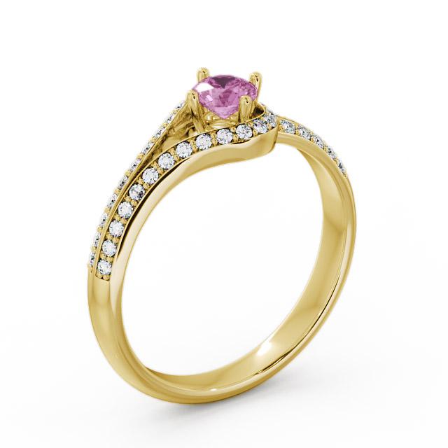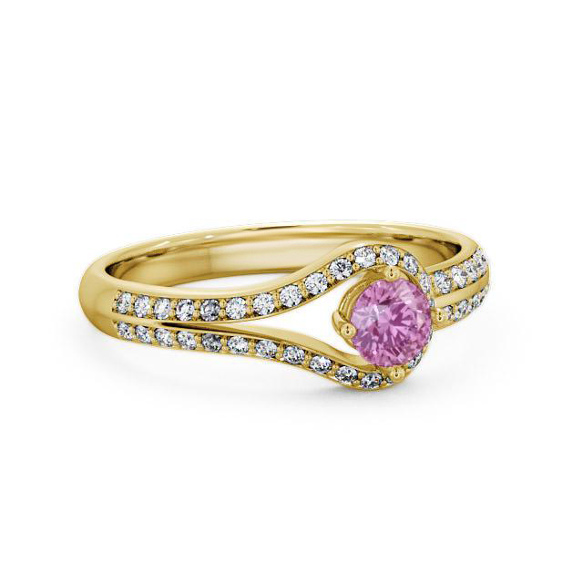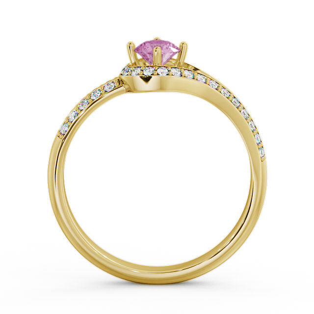 Arriana open halo pink sapphire and diamond 0.57ct ring in a 18K Yellow Gold setting. This contemporary ring features a 0.34 Carat round pink sapphire gemstone, augmented by sparkling round shaped diamonds weighing 0.23 Carat in total for a mesmerising allure. This ring is available in a range of metal options with AAA grade gemstone. We offer a free design service for any customised changes that you may require.