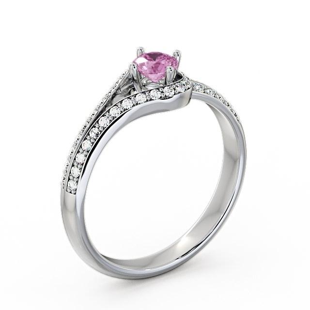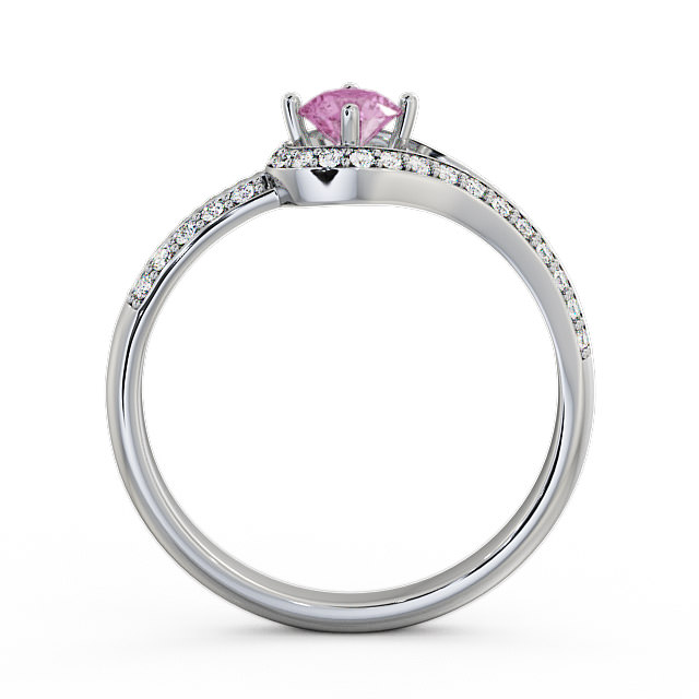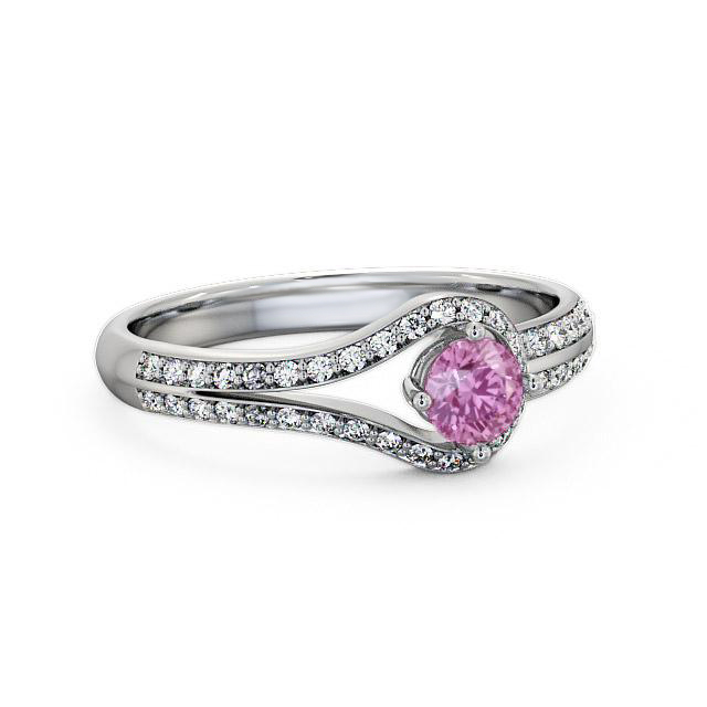Arriana open halo pink sapphire and diamond 0.57ct ring in a Palladium setting. This contemporary ring features a 0.34 Carat round pink sapphire gemstone, augmented by sparkling round shaped diamonds weighing 0.23 Carat in total for a mesmerising allure. This ring is available in a range of metal options with AAA grade gemstone. We offer a free design service for any customised changes that you may require.