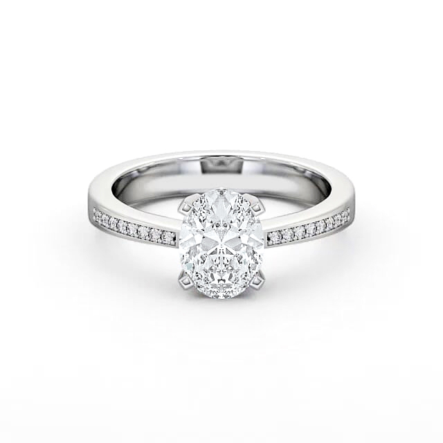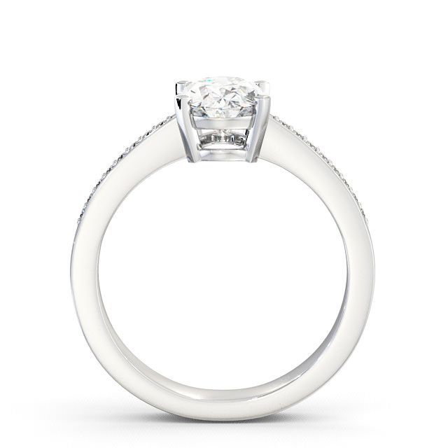 Kari diamond engagement ring with a four claw 18K White Gold setting. This captivating engagement ring features a stunning oval shaped diamond solitaire sitting between the line of round diamonds that run directly below it. Total diamond side stones weigh approximately 0.08ct with Clarity VS1 and Colour F. This ring is available in a range of metal options and your choice of natural or lab grown diamonds. We offer a free design service for any customised changes that you may require.