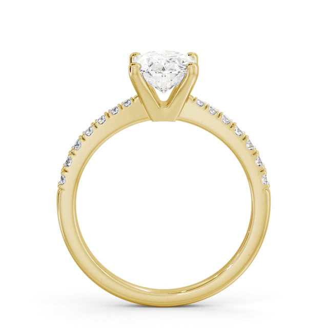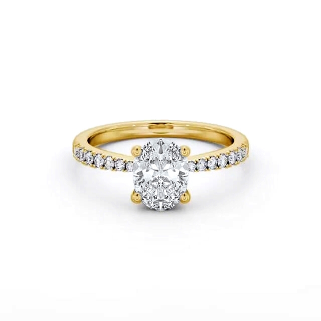 Perielle diamond engagement ring with a four claw 18K Yellow Gold setting. Elegantly glamourous, this majestic ring flaunts an oval shaped centre diamond and a row of small round diamonds on either side of the band. Total diamond side stones weigh approximately 0.14ct with Clarity VS1 and Colour F. This ring is available in a range of metal options and your choice of natural or lab grown diamonds. We offer a free design service for any customised changes that you may require.