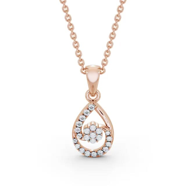 Aleah pear style diamond pendant in 9K Rose Gold. Splendid, this open pear shaped pendant is adorned with round diamonds, and a floral composite of round diamonds at the centre adds further sparkle to the look. This pendant is available in a range of metal and chain options with your choice of natural or lab grown diamonds. We offer a free design service for any customised changes that you may require.