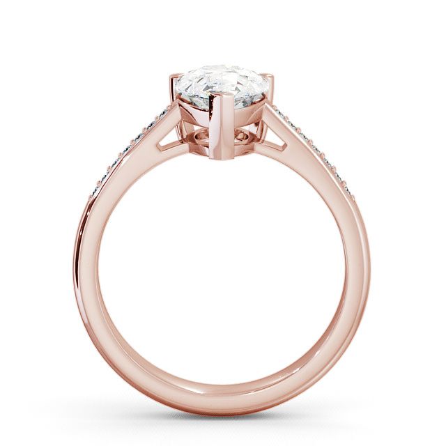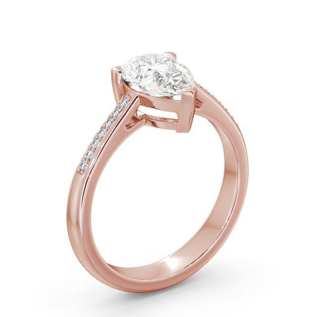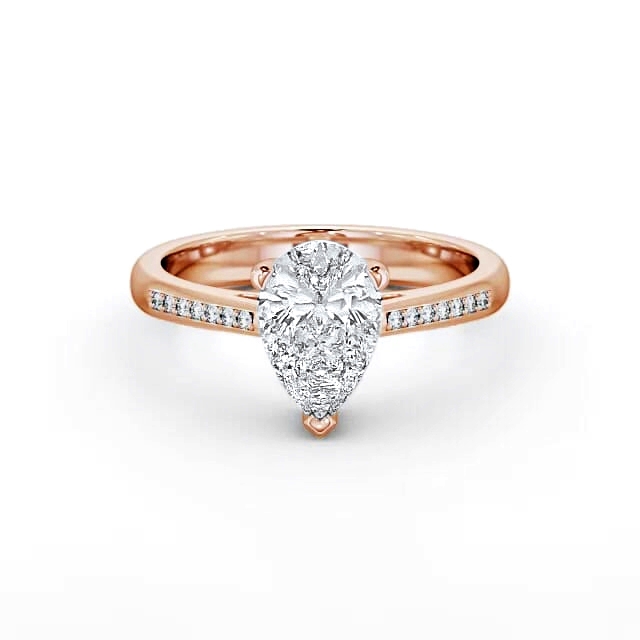 Emari diamond engagement ring with a three claw 18K Rose Gold setting. Featuring a stunning pear shaped diamond in the centre this engagement ring also has additional round diamonds on either side of the shoulder. Total diamond side stones weigh approximately 0.07ct with Clarity VS1 and Colour F. This ring is available in a range of metal options and your choice of natural or lab grown diamonds. We offer a free design service for any customised changes that you may require.