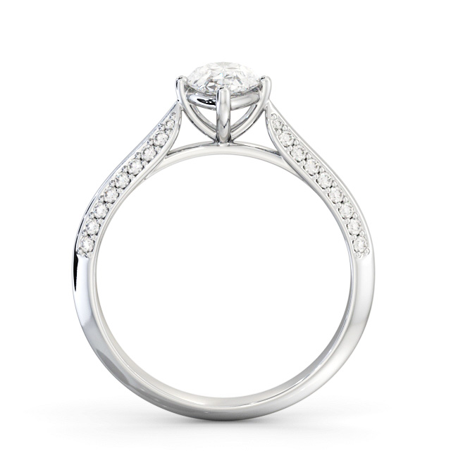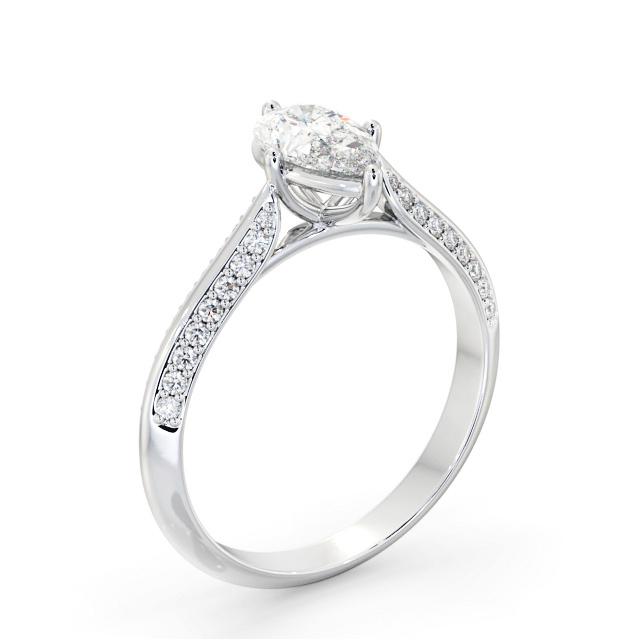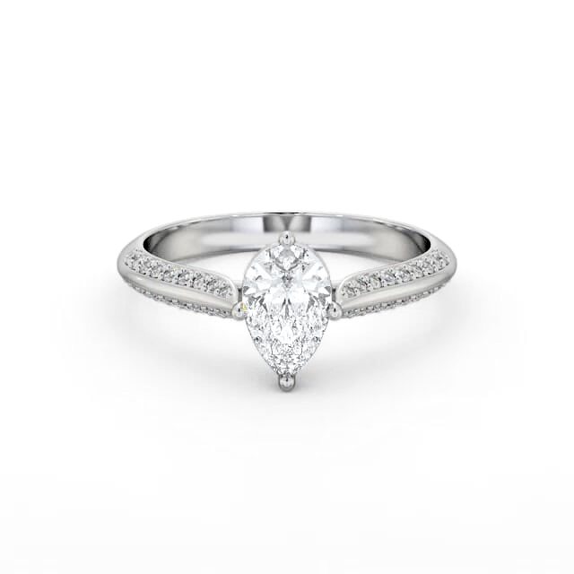 Emberley diamond engagement ring with a four claw 18K White Gold setting. This classic ring proudly displays an impeccable pear shaped centre diamond and a series of small round diamonds down each side of the knife edge band for a royal allure. Total diamond side stones weigh approximately 0.28ct with Clarity VS1 and Colour F. This ring is available in a range of metal options and your choice of natural or lab grown diamonds. We offer a free design service for any customised changes that you may require.