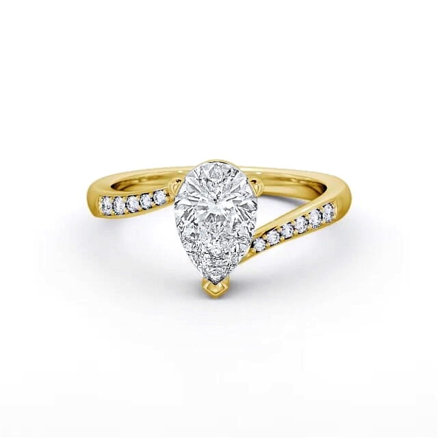 Danelly diamond engagement ring with a three claw 18K Yellow Gold setting. A pear shaped diamond solitaire in a three prong setting with a dazzling row of round diamonds on each shoulder of this bypass design ring. Total diamond side stones weigh approximately 0.10ct with Clarity VS1 and Colour F. This ring is available in a range of metal options and your choice of natural or lab grown diamonds. We offer a free design service for any customised changes that you may require.