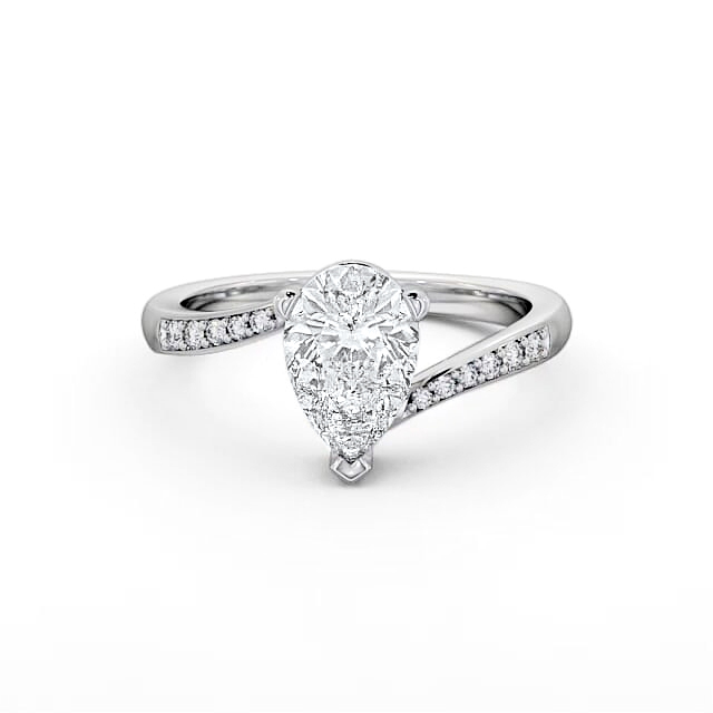 Danelly diamond engagement ring with a three claw 9K White Gold setting. A pear shaped diamond solitaire in a three prong setting with a dazzling row of round diamonds on each shoulder of this bypass design ring. Total diamond side stones weigh approximately 0.10ct with Clarity VS1 and Colour F. This ring is available in a range of metal options and your choice of natural or lab grown diamonds. We offer a free design service for any customised changes that you may require.