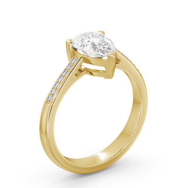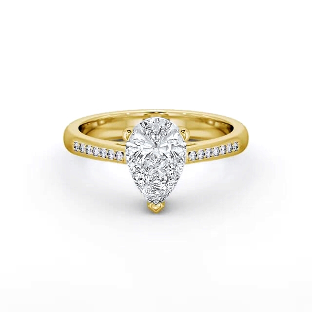 Emari diamond engagement ring with a three claw 9K Yellow Gold setting. Featuring a stunning pear shaped diamond in the centre this engagement ring also has additional round diamonds on either side of the shoulder. Total diamond side stones weigh approximately 0.07ct with Clarity VS1 and Colour F. This ring is available in a range of metal options and your choice of natural or lab grown diamonds. We offer a free design service for any customised changes that you may require.