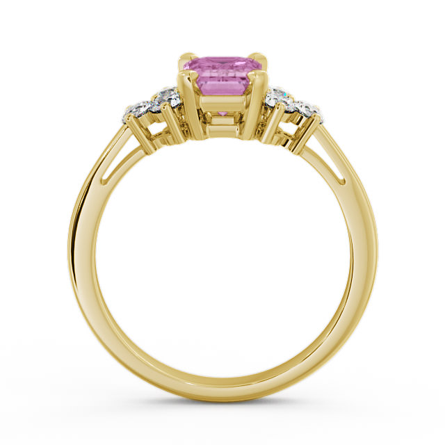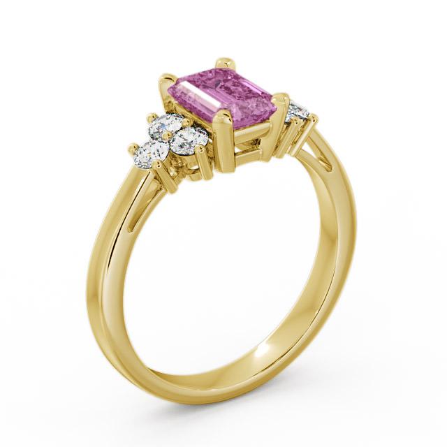 Melina pink sapphire and diamond 1.51ct ring in a 9K Yellow Gold setting. Truly refined, this gemstone and diamond ring showcases 1.15 Carat emerald shaped pink sapphire centre stone complemented by six sparkling round diamonds with a 0.36 Carat total weight. This ring is available in a range of metal options with AAA grade gemstone. We offer a free design service for any customised changes that you may require.