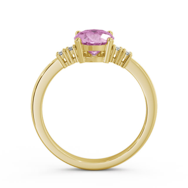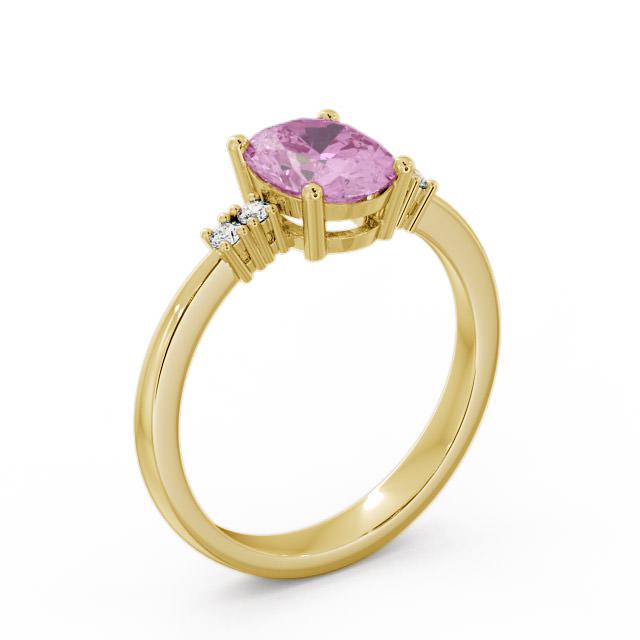 Zina pink sapphire and diamond 1.61ct ring in a 18K Yellow Gold setting. Electrifying 1.55 Carat oval shaped pink sapphire gemstone is cradled by four round shaped 0.06 Carat total weight diamonds to add extra detailing and sparkle to this ring. This ring is available in a range of metal options with AAA grade gemstone. We offer a free design service for any customised changes that you may require.