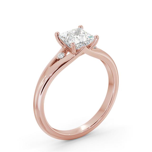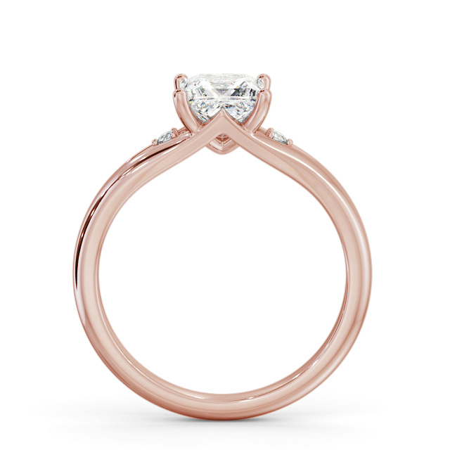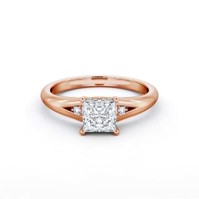 Chrisette diamond engagement ring with a four claw 18K Rose Gold setting. Beauty in its simplicity, this ring displays a princess shaped centre diamond flanked by two round diamonds in a split design band for a graceful elegance. Total diamond side stones weigh approximately 0.02ct with Clarity VS1 and Colour F. This ring is available in a range of metal options and your choice of natural or lab grown diamonds. We offer a free design service for any customised changes that you may require.