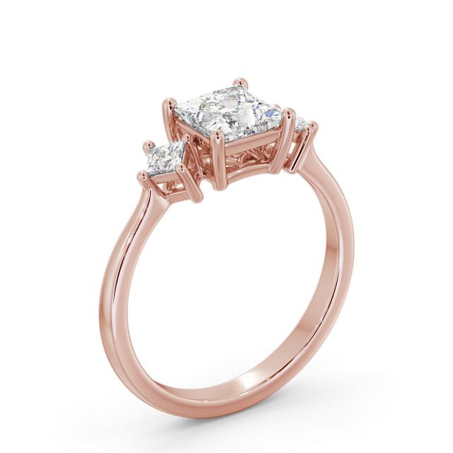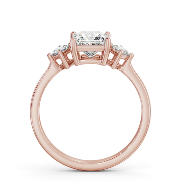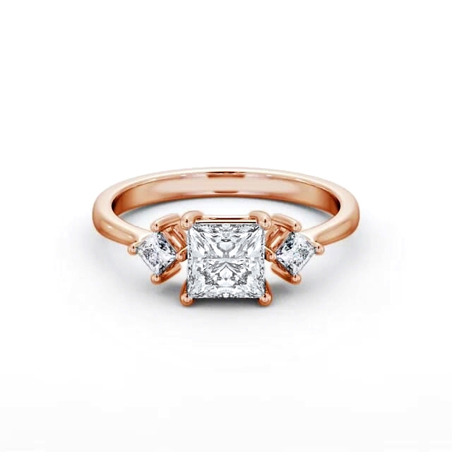Haniya diamond engagement ring with a four claw 18K Rose Gold setting. This exquisite ring shimmers with a ravishing princess shaped centre diamond, complemented by a pair of perfectly matched small princess shaped side diamonds. Total diamond side stones weigh approximately 0.12ct with Clarity VS1 and Colour F. This ring is available in a range of metal options and your choice of natural or lab grown diamonds. We offer a free design service for any customised changes that you may require.