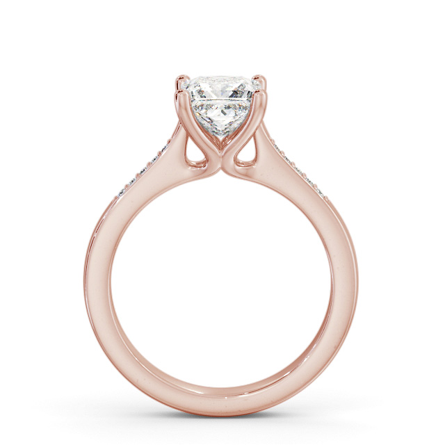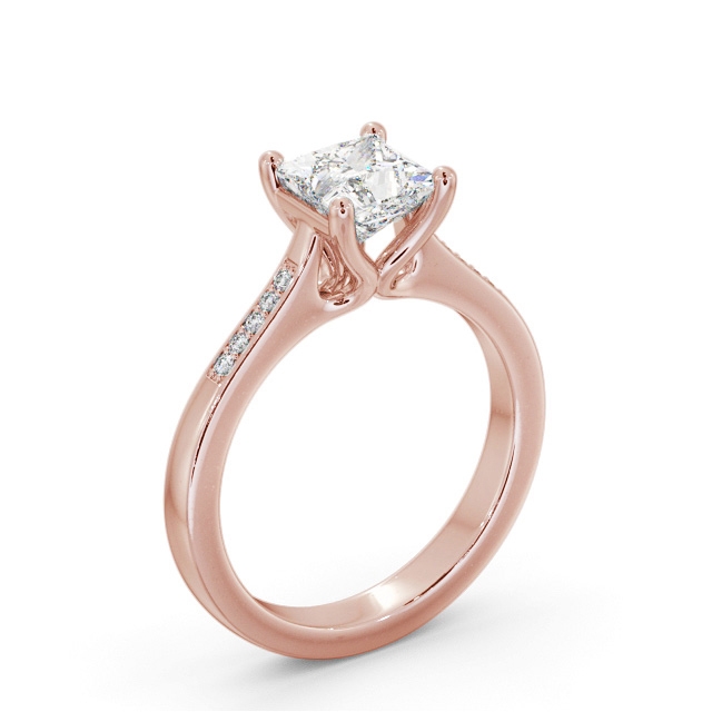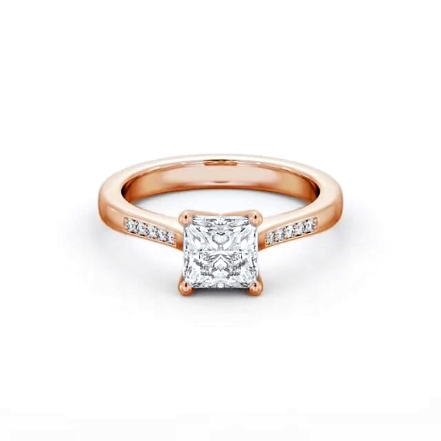 Innes diamond engagement ring with a four claw 18K Rose Gold setting. Undeniably striking, a princess shaped centre diamond and small round diamond studded shoulders enhances the scintillating beauty of this ring. Total diamond side stones weigh approximately 0.07ct with Clarity VS1 and Colour F. This ring is available in a range of metal options and your choice of natural or lab grown diamonds. We offer a free design service for any customised changes that you may require.