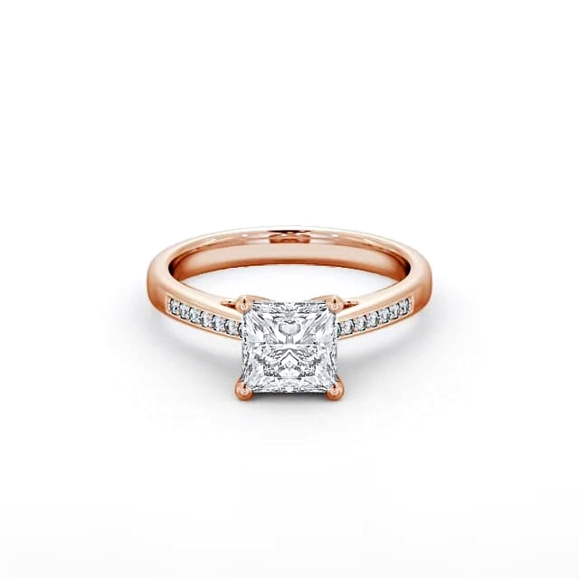 Jubilee diamond engagement ring with a four claw 18K Rose Gold setting. This alluring engagement ring reveals a centre princess-cut diamond high set amidst four-prongs, aided by seamless row of small round diamonds on each shoulder. Total diamond side stones weigh approximately 0.08ct with Clarity VS1 and Colour F. This ring is available in a range of metal options and your choice of natural or lab grown diamonds. We offer a free design service for any customised changes that you may require.