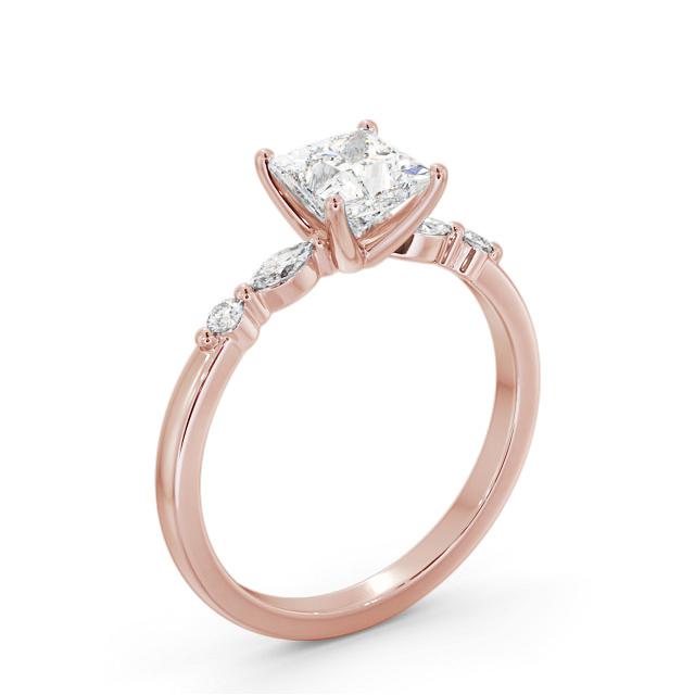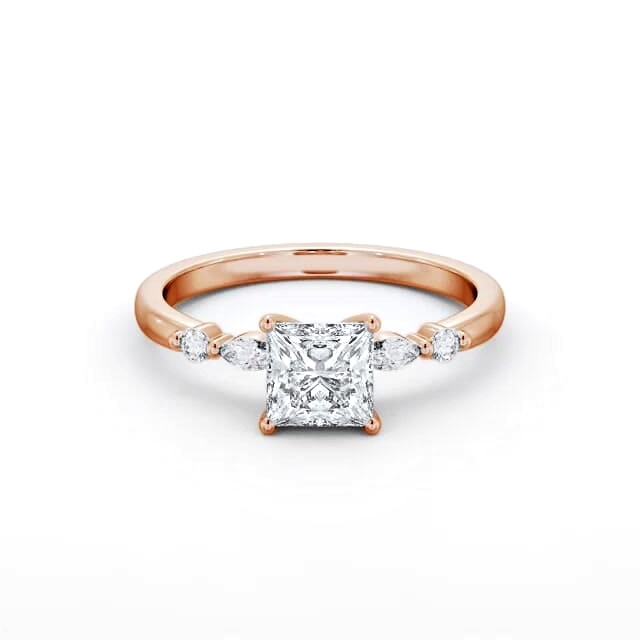 Milagros diamond engagement ring with a four claw 18K Rose Gold setting. This contemporary ring features a princess shaped diamond prong set in the centre, topped with marquise and round shaped diamonds and a sleek polished finish band. Total diamond side stones weigh approximately 0.13ct with Clarity VS1 and Colour F. This ring is available in a range of metal options and your choice of natural or lab grown diamonds. We offer a free design service for any customised changes that you may require.