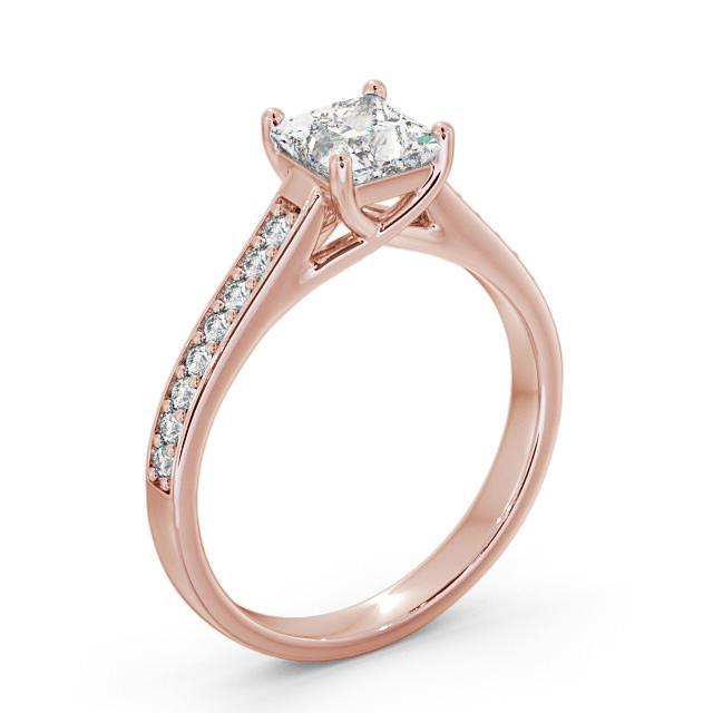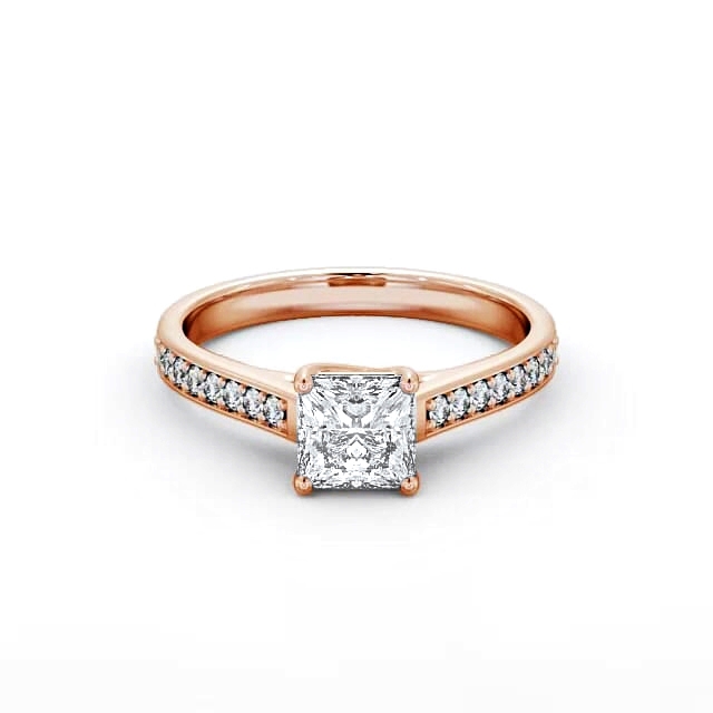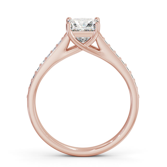 Miley diamond engagement ring with a four claw 18K Rose Gold setting. This dazzling ring flaunts a large princess shaped centre diamond, along with an array of small sparkling round diamonds on each side of the band. Total diamond side stones weigh approximately 0.15ct with Clarity VS1 and Colour F. This ring is available in a range of metal options and your choice of natural or lab grown diamonds. We offer a free design service for any customised changes that you may require.
