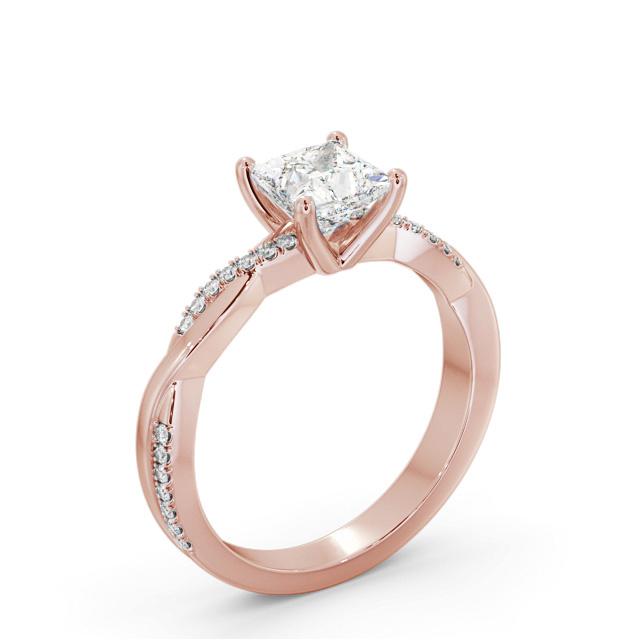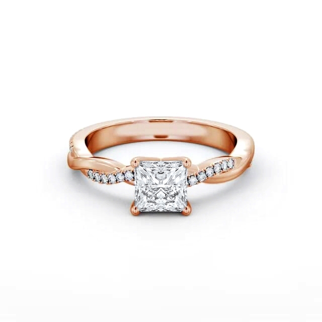 Natasha diamond engagement ring with a four claw 18K Rose Gold setting. On the top of the ring, a princess shaped centre diamond rises above to allow the light to pass through and small round diamonds flow smoothly down the cross over band. Total diamond side stones weigh approximately 0.17ct with Clarity VS1 and Colour F. This ring is available in a range of metal options and your choice of natural or lab grown diamonds. We offer a free design service for any customised changes that you may require.