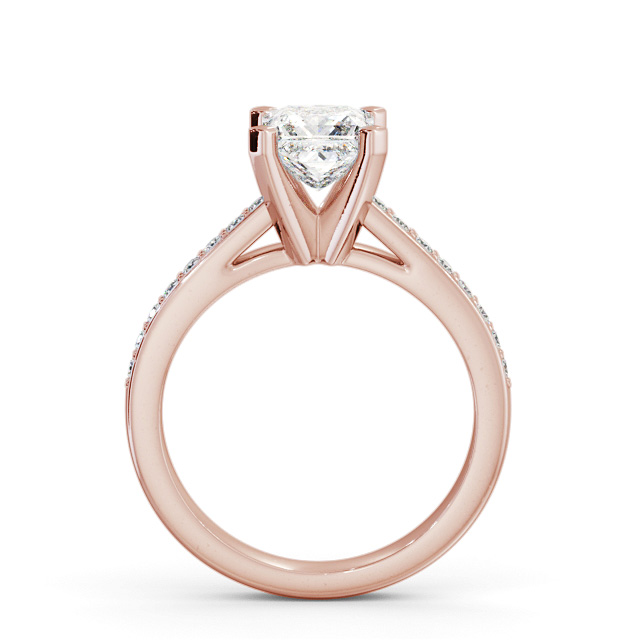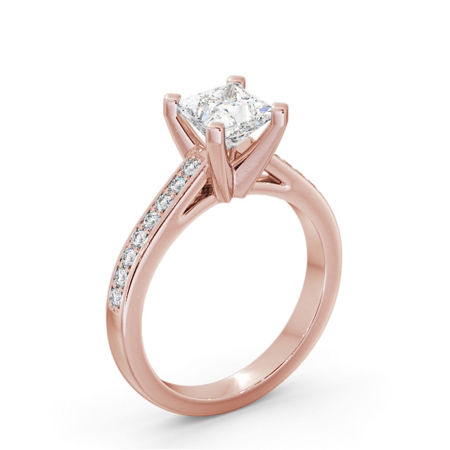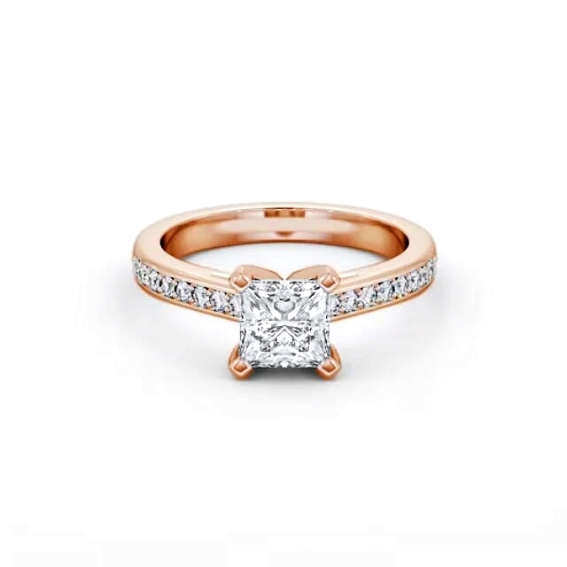 Tanine diamond engagement ring with a four claw 18K Rose Gold setting. Simple yet contemporary, this ring showcases a princess shaped diamond at the centre and a line of small round diamonds on either side of the band. Total diamond side stones weigh approximately 0.16ct with Clarity VS1 and Colour F. This ring is available in a range of metal options and your choice of natural or lab grown diamonds. We offer a free design service for any customised changes that you may require.