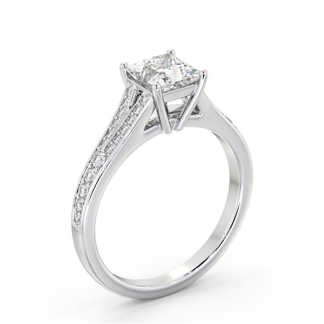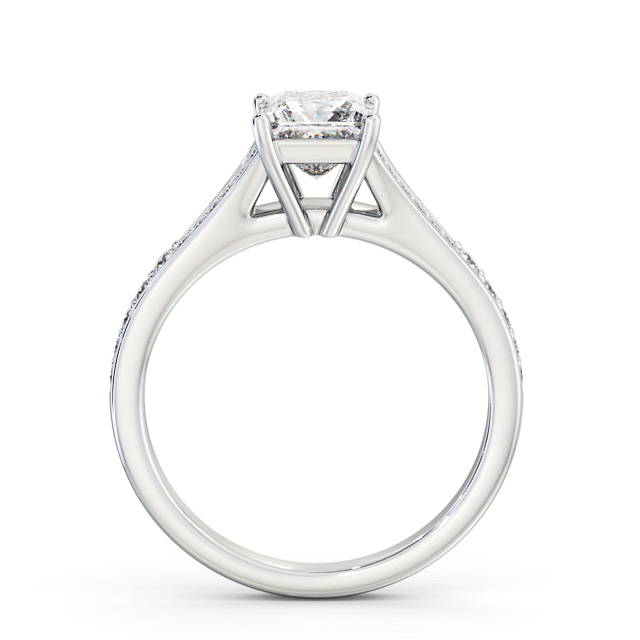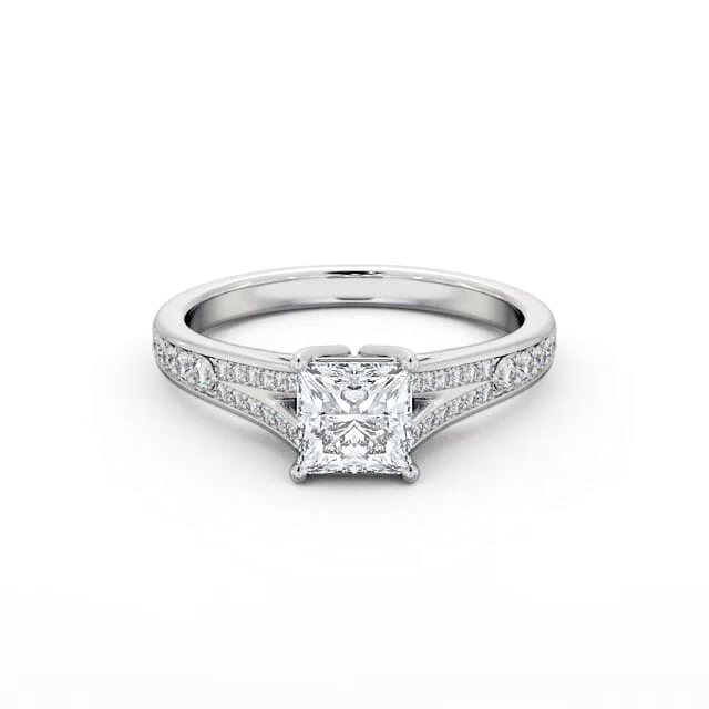 Arlett diamond engagement ring with a four claw 18K White Gold setting. Brilliant in every way, this fashionable ring presents a princess shaped centre diamond complemented by smaller round diamond studded split shoulders. Total diamond side stones weigh approximately 0.28ct with Clarity VS1 and Colour F. This ring is available in a range of metal options and your choice of natural or lab grown diamonds. We offer a free design service for any customised changes that you may require.