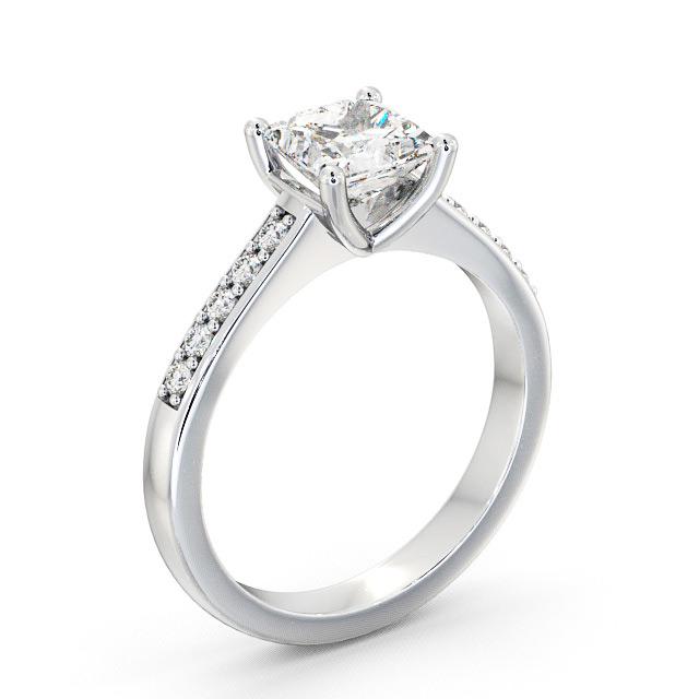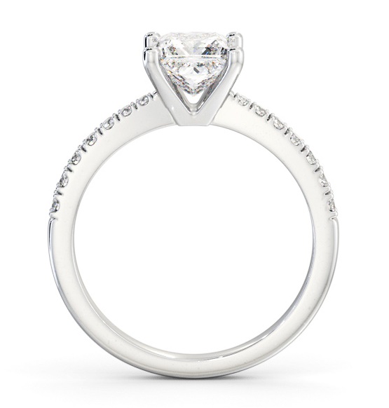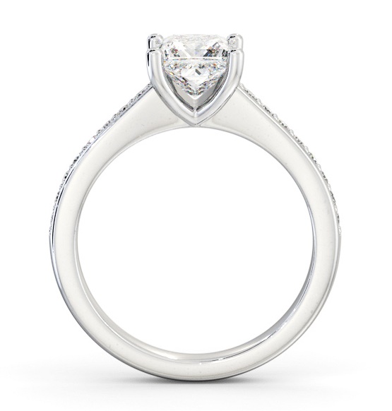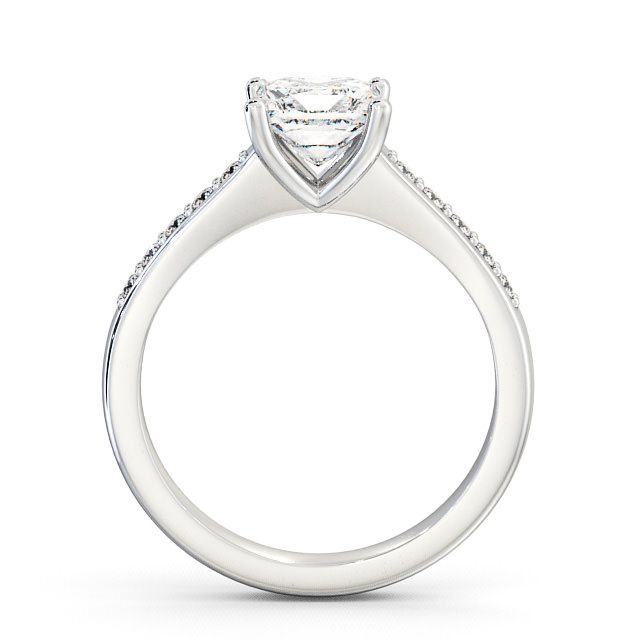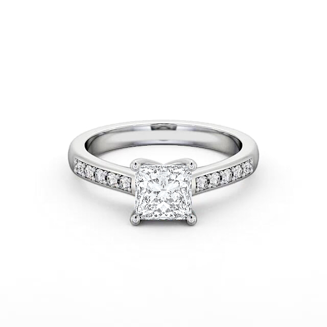 Gianna diamond engagement ring with a four claw 18K White Gold setting. Simply stunning, this engagement ring exhibits a graceful princess cut diamond centre enhanced by smaller round diamonds set shoulders. Total diamond side stones weigh approximately 0.15ct with Clarity VS1 and Colour F. This ring is available in a range of metal options and your choice of natural or lab grown diamonds. We offer a free design service for any customised changes that you may require.