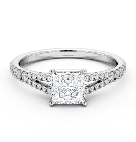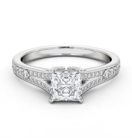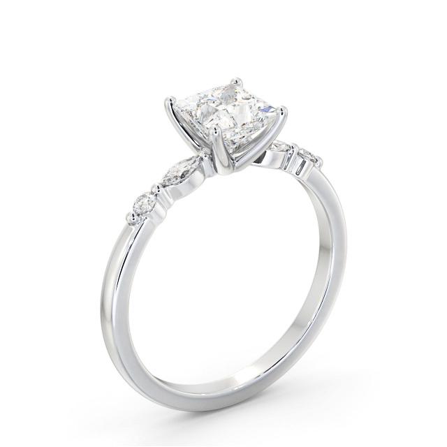 Milagros diamond engagement ring with a four claw 18K White Gold setting. This contemporary ring features a princess shaped diamond prong set in the centre, topped with marquise and round shaped diamonds and a sleek polished finish band. Total diamond side stones weigh approximately 0.13ct with Clarity VS1 and Colour F. This ring is available in a range of metal options and your choice of natural or lab grown diamonds. We offer a free design service for any customised changes that you may require.