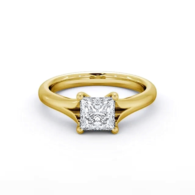 Beale diamond engagement ring with a four claw 18K Yellow Gold setting. This alluring V shaped split design ring embraces a sparkling princess-cut diamond in a four prong setting with a mid band width of 2mm. This ring is available in a range of metal options and your choice of natural or lab grown diamonds. We offer a free design service for any customised changes that you may require.