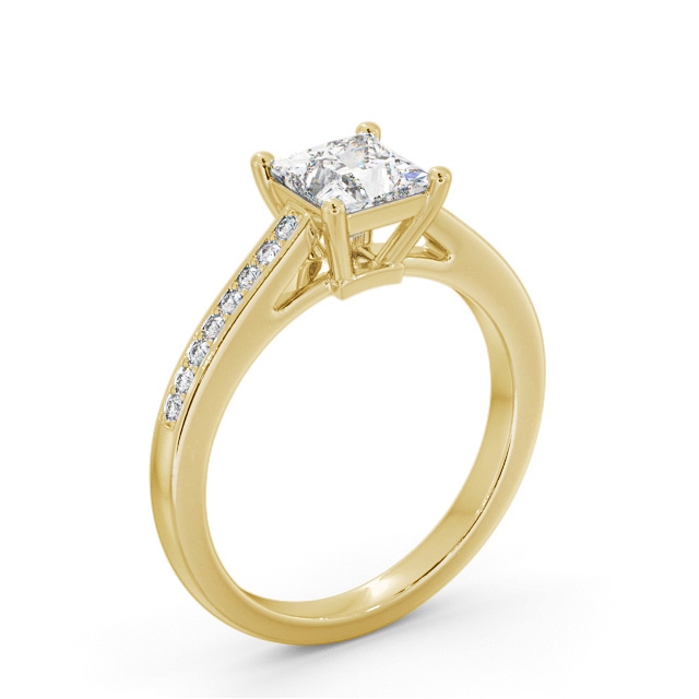 Annabella diamond engagement ring with a four claw 18K Yellow Gold setting. Brilliant and scintillating, this ring showcases a princess shaped centre diamond complemented by small round diamonds on each side of the band. Total diamond side stones weigh approximately 0.10ct with Clarity VS1 and Colour F. This ring is available in a range of metal options and your choice of natural or lab grown diamonds. We offer a free design service for any customised changes that you may require.