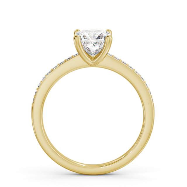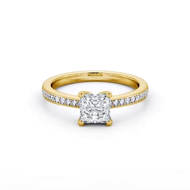 Emoni diamond engagement ring with a four claw 18K Yellow Gold setting. Simply stunning, this ring displays a prong set princess shaped diamond at it's centre and smaller round diamonds on a slender band. Total diamond side stones weigh approximately 0.12ct with Clarity VS1 and Colour F. This ring is available in a range of metal options and your choice of natural or lab grown diamonds. We offer a free design service for any customised changes that you may require.