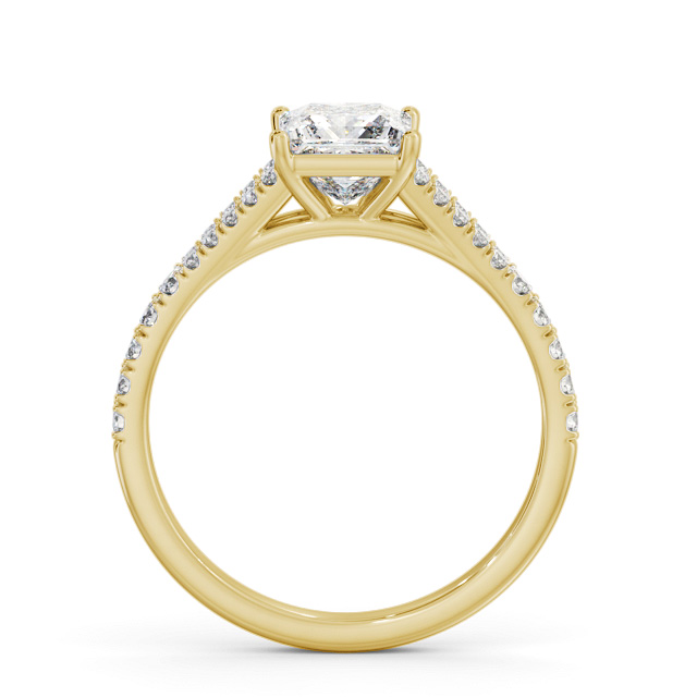 Kerrigan diamond engagement ring with a four claw 18K Yellow Gold setting. Perfectly stunning, this engagement ring features a princess shaped diamond resting over split design shank, adorned with small round diamonds. Total diamond side stones weigh approximately 0.25ct with Clarity VS1 and Colour F. This ring is available in a range of metal options and your choice of natural or lab grown diamonds. We offer a free design service for any customised changes that you may require.
