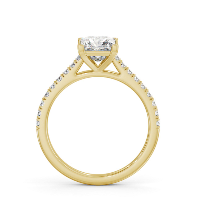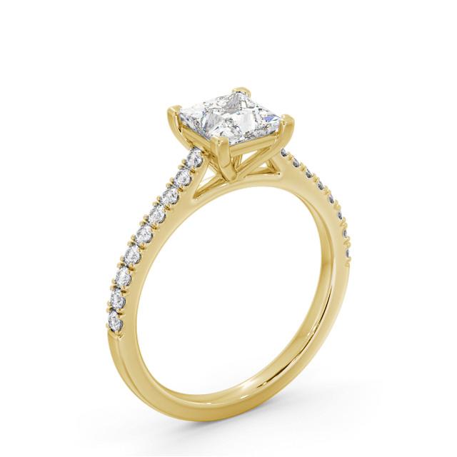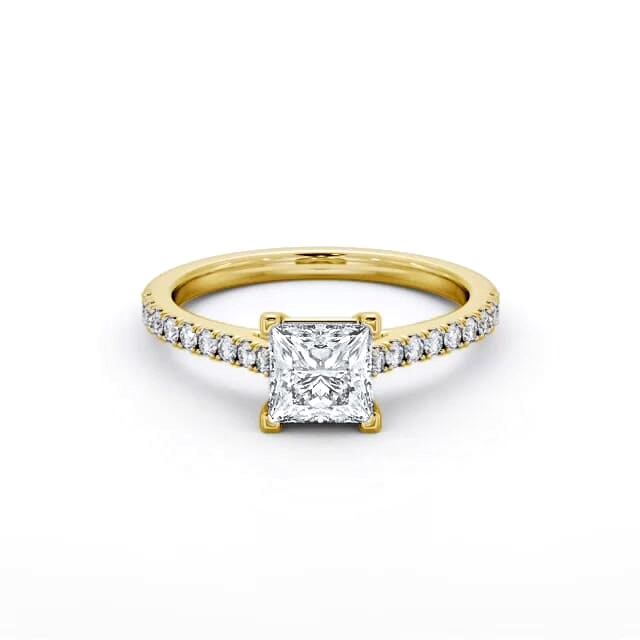 Laniah diamond engagement ring with a four claw 18K Yellow Gold setting. A magnificent ring with a large princess shaped centre diamond firmly mounted on small round diamond studded shoulders. Total diamond side stones weigh approximately 0.26ct with Clarity VS1 and Colour F. This ring is available in a range of metal options and your choice of natural or lab grown diamonds. We offer a free design service for any customised changes that you may require.
