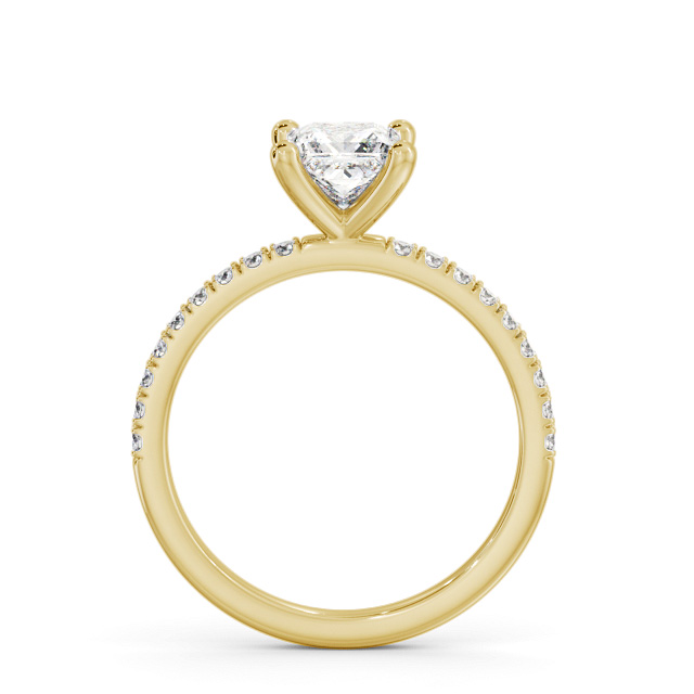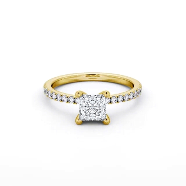 Peighton diamond engagement ring with a four claw 18K Yellow Gold setting. A princess shaped centre diamond is perfectly complemented by small round diamond accented shoulders to add a touch of royalty to this enchaining engagement ring. Total diamond side stones weigh approximately 0.28ct with Clarity VS1 and Colour F. This ring is available in a range of metal options and your choice of natural or lab grown diamonds. We offer a free design service for any customised changes that you may require.