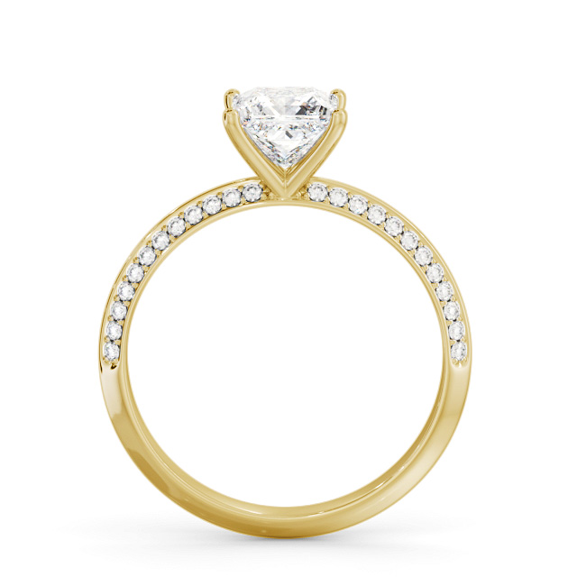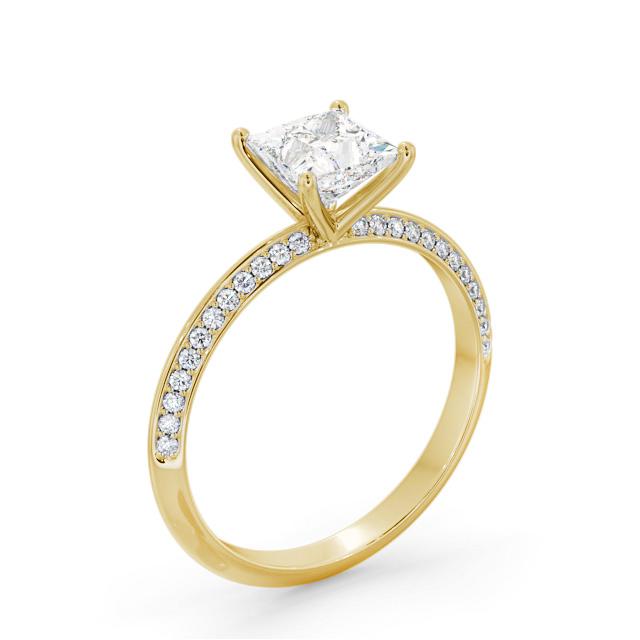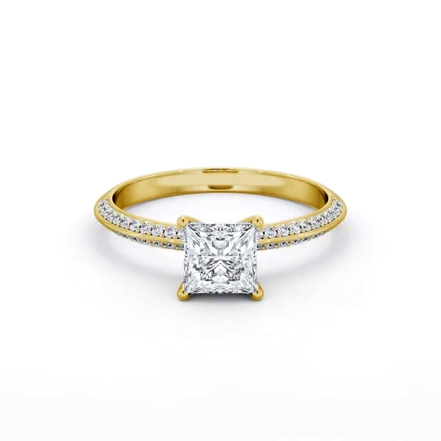 Rayana diamond engagement ring with a four claw 18K Yellow Gold setting. This timeless ring offers a beloved princess shaped diamond set atop, and small round diamonds sliding down on both sides of the knife edge band. Total diamond side stones weigh approximately 0.28ct with Clarity VS1 and Colour F. This ring is available in a range of metal options and your choice of natural or lab grown diamonds. We offer a free design service for any customised changes that you may require.