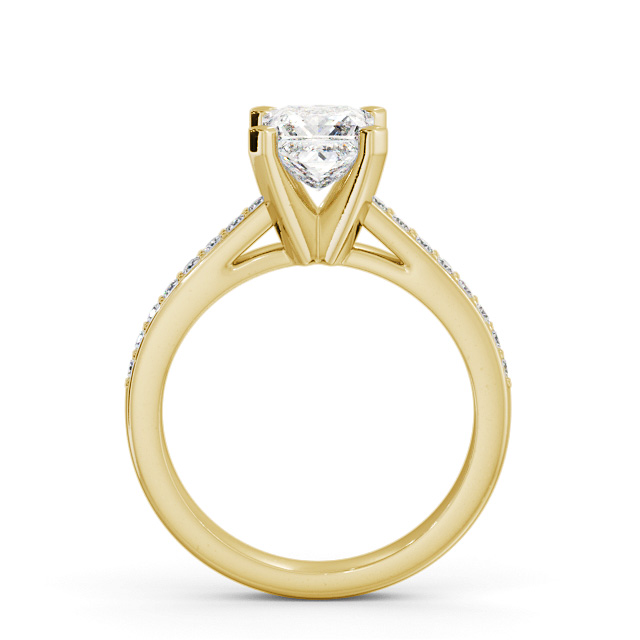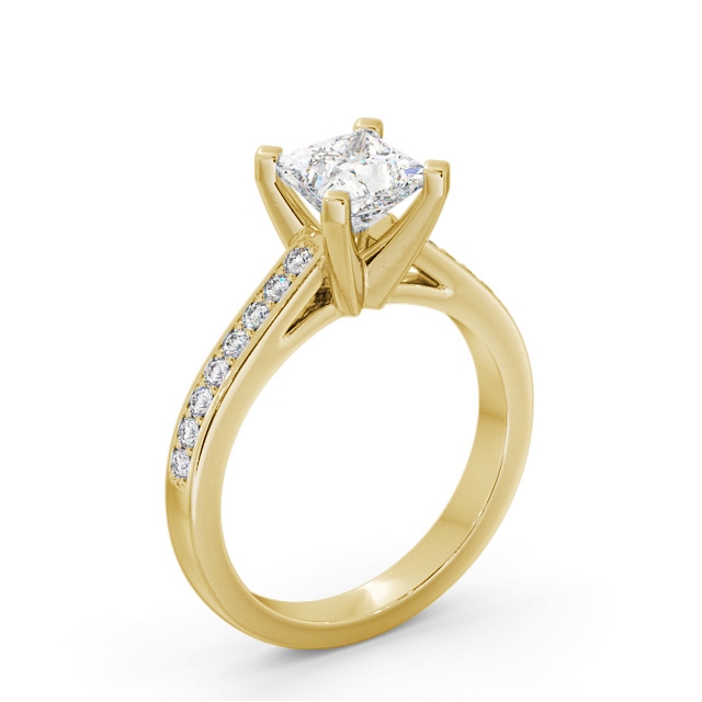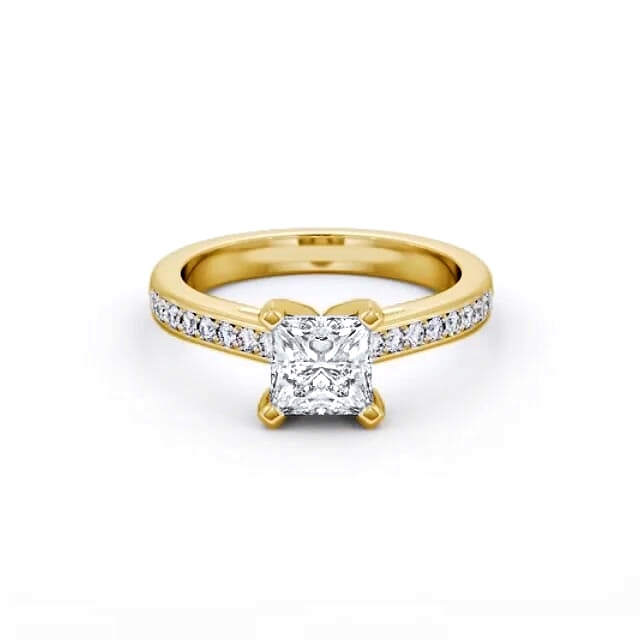Tanine diamond engagement ring with a four claw 18K Yellow Gold setting. Simple yet contemporary, this ring showcases a princess shaped diamond at the centre and a line of small round diamonds on either side of the band. Total diamond side stones weigh approximately 0.16ct with Clarity VS1 and Colour F. This ring is available in a range of metal options and your choice of natural or lab grown diamonds. We offer a free design service for any customised changes that you may require.