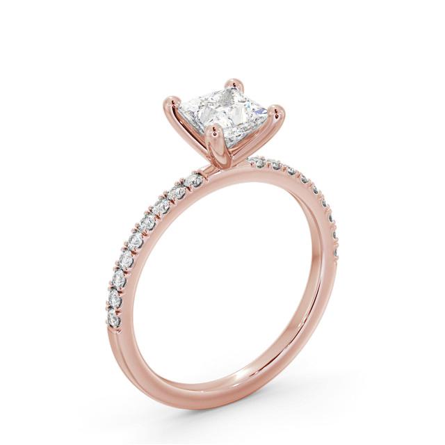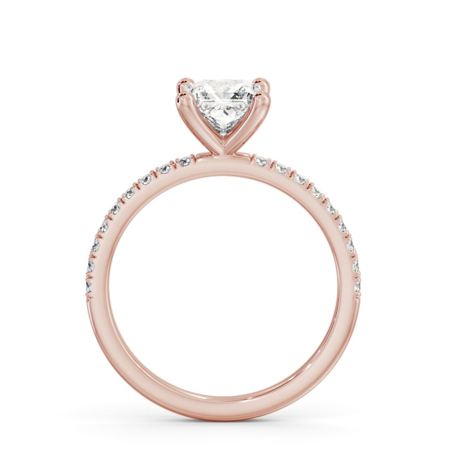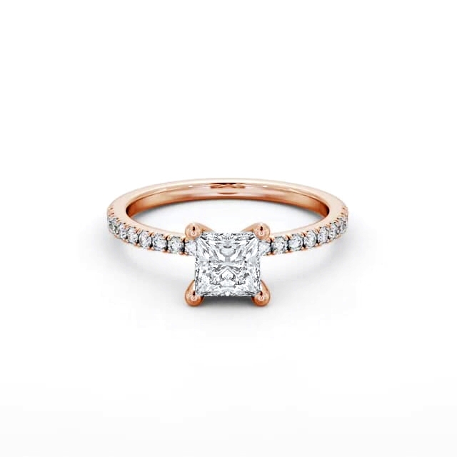 Peighton diamond engagement ring with a four claw 9K Rose Gold setting. A princess shaped centre diamond is perfectly complemented by small round diamond accented shoulders to add a touch of royalty to this enchaining engagement ring. Total diamond side stones weigh approximately 0.28ct with Clarity VS1 and Colour F. This ring is available in a range of metal options and your choice of natural or lab grown diamonds. We offer a free design service for any customised changes that you may require.