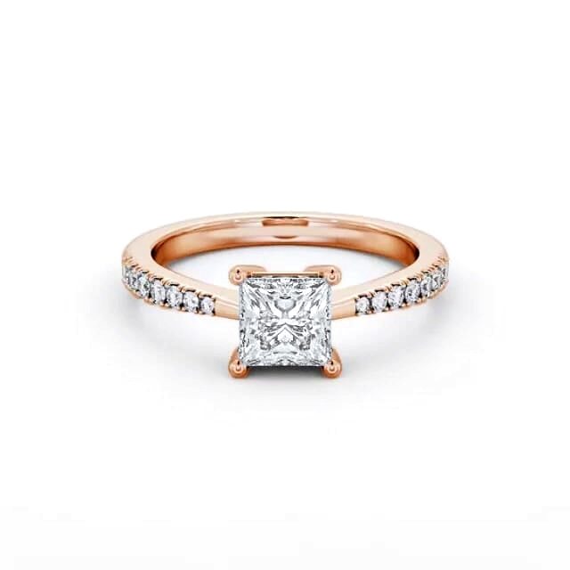 Raniya diamond engagement ring with a four claw 9K Rose Gold setting. Beautifully designed, this ring showcases a princess shaped diamond at the centre and additional round diamonds on a tapered band. Total diamond side stones weigh approximately 0.14ct with Clarity VS1 and Colour F. This ring is available in a range of metal options and your choice of natural or lab grown diamonds. We offer a free design service for any customised changes that you may require.