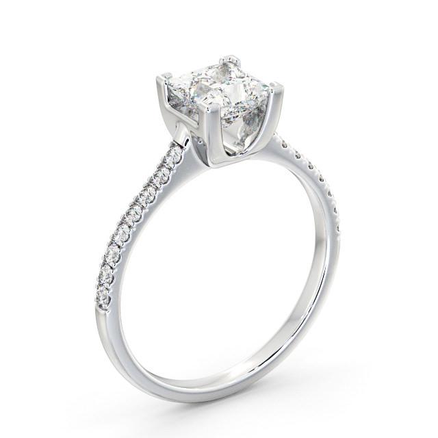 Amirah diamond engagement ring with a four claw 9K White Gold setting. A touch of modernity, this ring unveils a large princess shaped diamond in the centre accentuated by a row of smaller round diamonds on each shoulder. Total diamond side stones weigh approximately 0.15ct with Clarity VS1 and Colour F. This ring is available in a range of metal options and your choice of natural or lab grown diamonds. We offer a free design service for any customised changes that you may require.