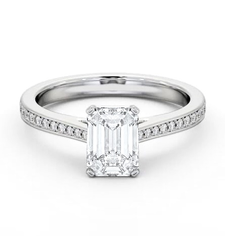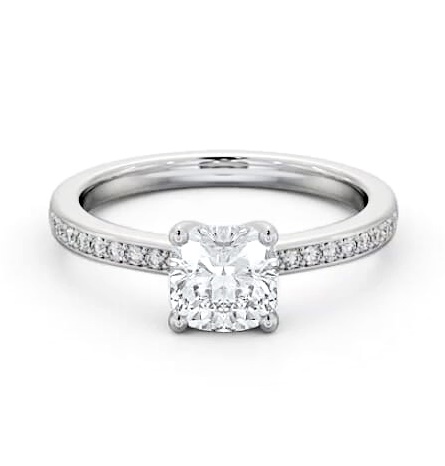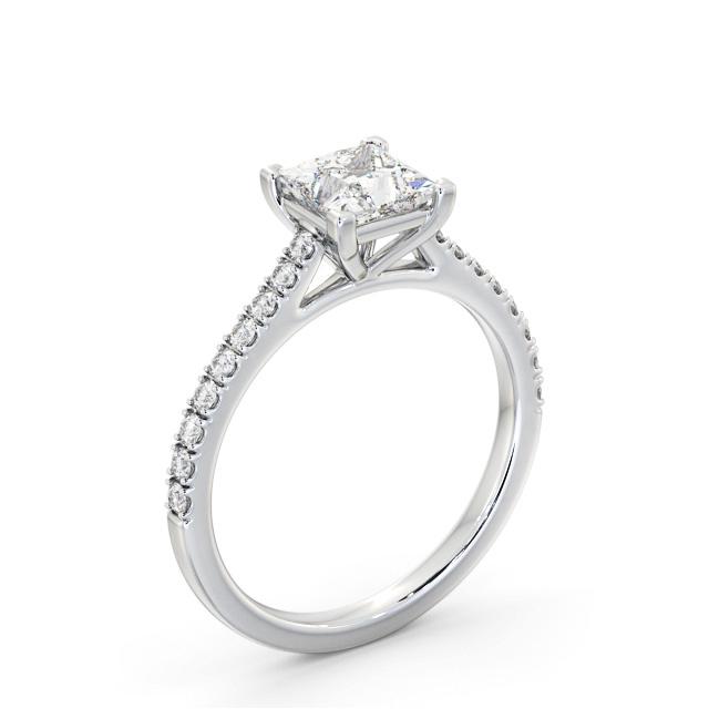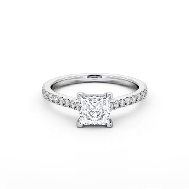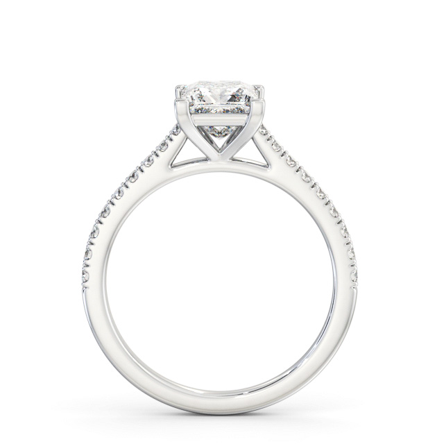 Laniah diamond engagement ring with a four claw 9K White Gold setting. A magnificent ring with a large princess shaped centre diamond firmly mounted on small round diamond studded shoulders. Total diamond side stones weigh approximately 0.26ct with Clarity VS1 and Colour F. This ring is available in a range of metal options and your choice of natural or lab grown diamonds. We offer a free design service for any customised changes that you may require.