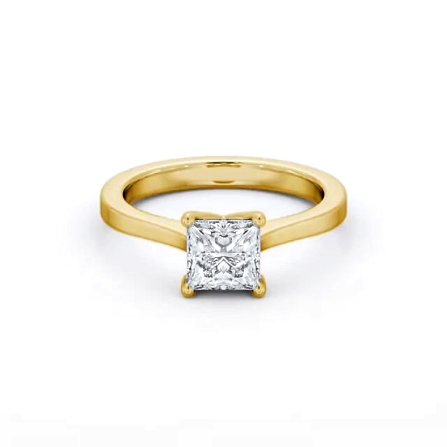 Hallie diamond engagement ring with a four claw 9K Yellow Gold setting. This glamourous ring is adorned with a gorgeous princess shaped diamond claw set into a brightly polished band. This ring is available in a range of metal options and your choice of natural or lab grown diamonds. We offer a free design service for any customised changes that you may require.