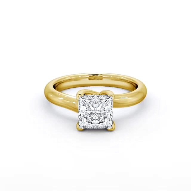 Tayah diamond engagement ring with a four claw 9K Yellow Gold setting. Unique and elegant, this engagement ring features a princess shaped diamond solitaire in a sweeping four prong setting. With a mid band width of 2.2mm, this ring is available in a range of metal options and your choice of natural or lab grown diamonds. We offer a free design service for any customised changes that you may require.