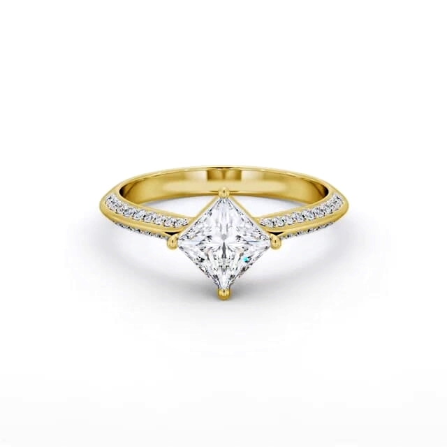 Layken diamond engagement ring with a four claw rotated head 9K Yellow Gold setting. Classic and enduring, the four pronged basket head hosts a gorgeous princess shaped diamond atop and small round diamonds line the knife edge band. Total diamond side stones weigh approximately 0.32ct with Clarity VS1 and Colour F. This ring is available in a range of metal options and your choice of natural or lab grown diamonds. We offer a free design service for any customised changes that you may require.