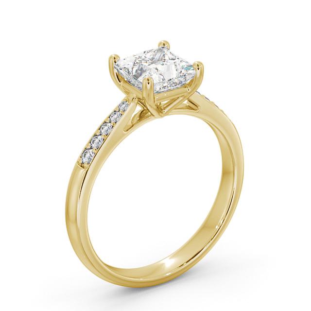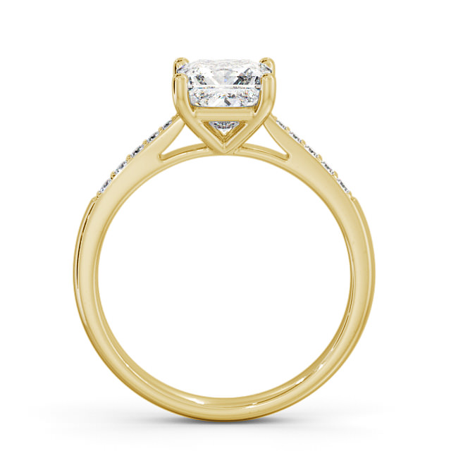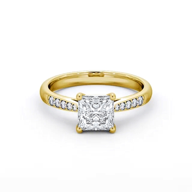 Nandi diamond engagement ring with a four claw 9K Yellow Gold setting. Bold, beautiful and feminine, this engagement ring exposes a sparkling four-prong set princess shaped centre diamond aided by sparkling round diamonds studded band. Total diamond side stones weigh approximately 0.08ct with Clarity VS1 and Colour F. This ring is available in a range of metal options and your choice of natural or lab grown diamonds. We offer a free design service for any customised changes that you may require.