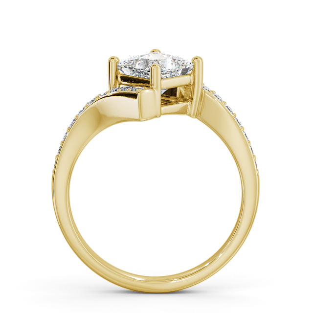 Nasira diamond engagement ring with a four claw 9K Yellow Gold setting. This bypass style ring features a central princess shaped diamond topped with small round diamond studded shoulders. Total diamond side stones weigh approximately 0.20ct with Clarity VS1 and Colour F. This ring is available in a range of metal options and your choice of natural or lab grown diamonds. We offer a free design service for any customised changes that you may require.
