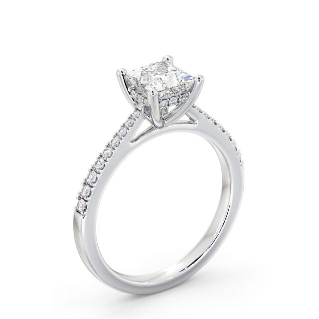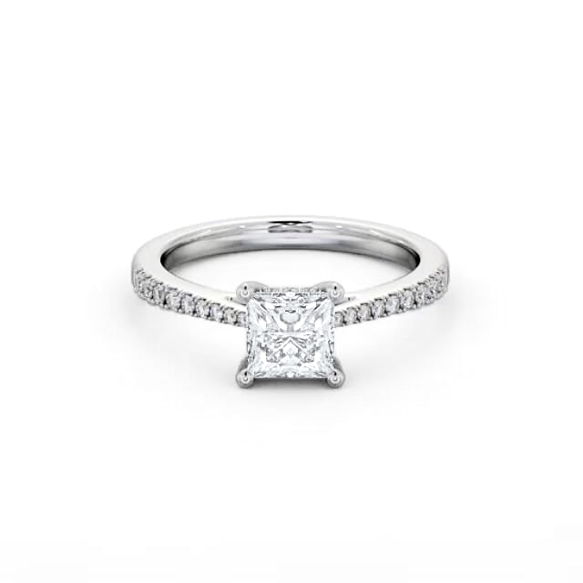 Delila diamond engagement ring with a four claw Palladium setting. Unconditionally stunning, a magnificent princess shaped diamond set at the centre of the ring is further adorned with small round diamonds along the band and gallery rail. Total diamond side stones weigh approximately 0.16ct with Clarity VS1 and Colour F. This ring is available in a range of metal options and your choice of natural or lab grown diamonds. We offer a free design service for any customised changes that you may require.