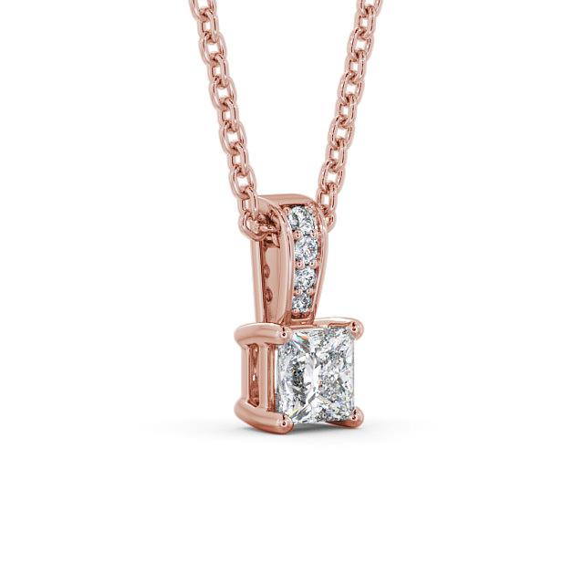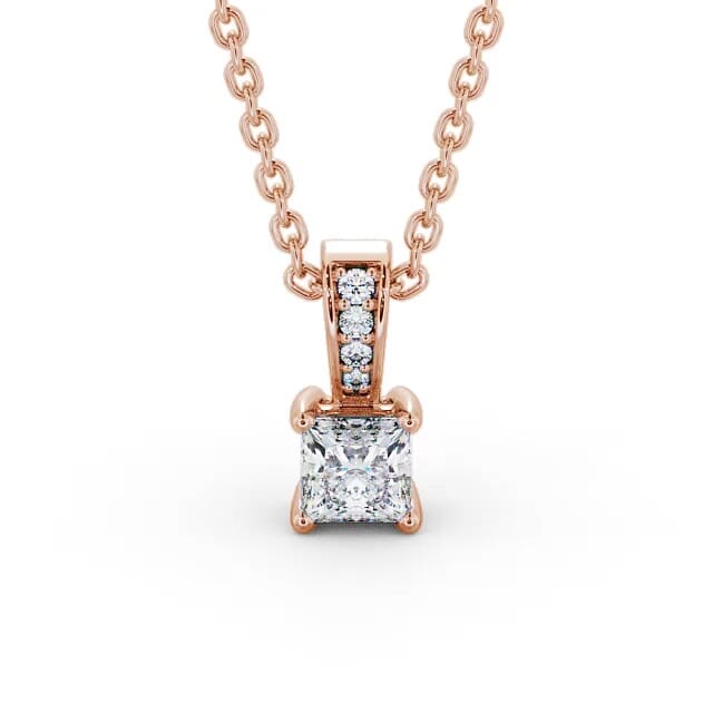 Jaylah solitaire stud diamond pendant in 18K Rose Gold. A timeless classic, this pendant features a single princess shaped diamond set in a four prong basket with a chic diamond studded bail. This pendant is available in a range of metal and chain options with your choice of natural or lab grown diamonds. We offer a free design service for any customised changes that you may require.