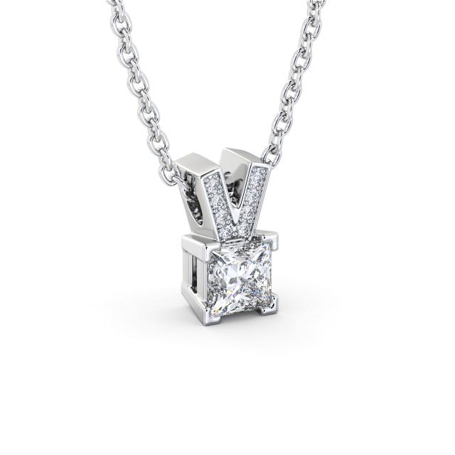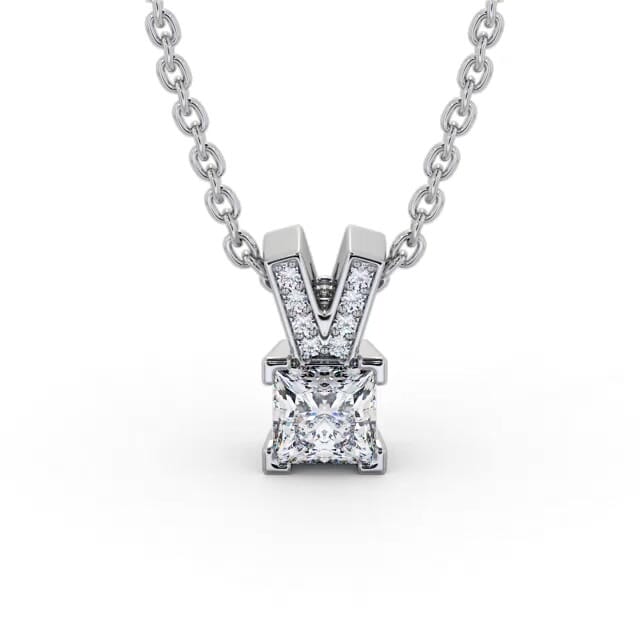Montana solitaire stud diamond pendant in 9K White Gold. Uniquely styled this solitaire pendant is accentuated with a single princess cut diamond and a small round diamond accented split design bail. This pendant is available in a range of metal and chain options with your choice of natural or lab grown diamonds. We offer a free design service for any customised changes that you may require.