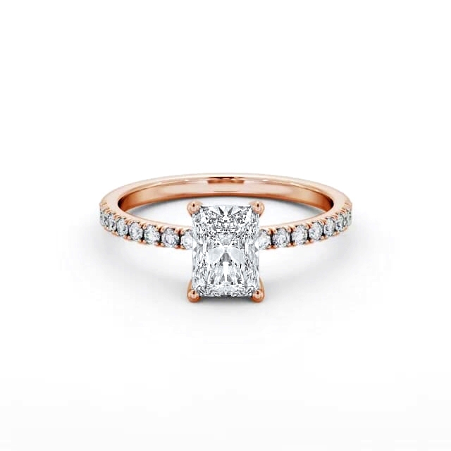 Meklit diamond engagement ring with a four claw 9K Rose Gold setting. A scintillating radiant shaped diamond centre and small round diamond embedded shoulders add remarkable allure to this engagement ring. Total diamond side stones weigh approximately 0.25ct with Clarity VS1 and Colour F. This ring is available in a range of metal options and your choice of natural or lab grown diamonds. We offer a free design service for any customised changes that you may require.