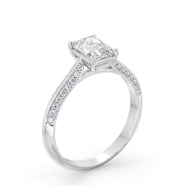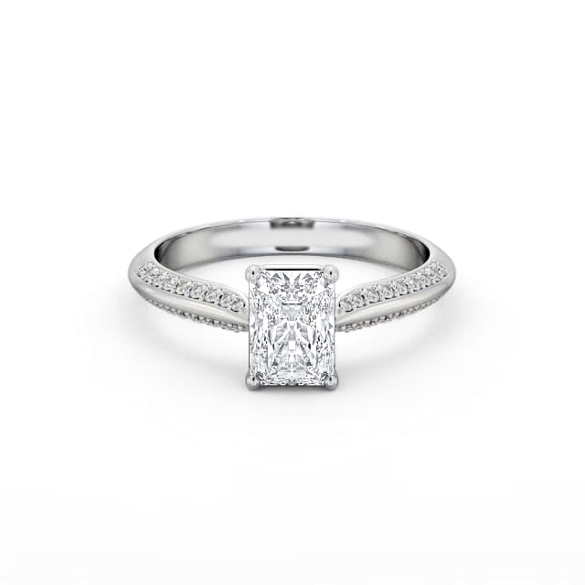 Joelle diamond engagement ring with a four claw 9K White Gold setting. This classic ring dazzles with a radiant shaped centre diamond, flanked by small diamonds flowing down each side of knife edge design band. Total diamond side stones weigh approximately 0.28ct with Clarity VS1 and Colour F. This ring is available in a range of metal options and your choice of natural or lab grown diamonds. We offer a free design service for any customised changes that you may require.