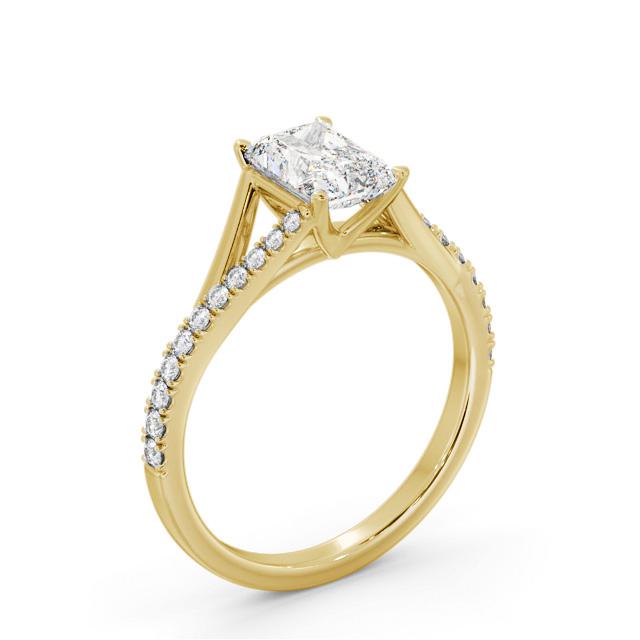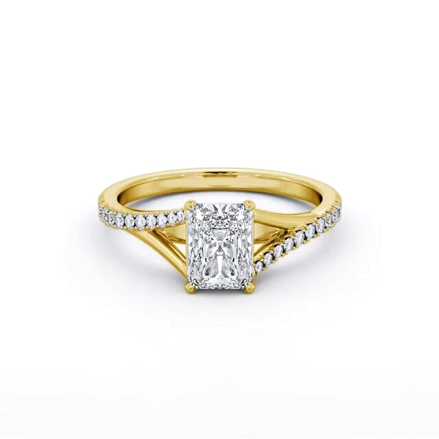 Aubrielle diamond engagement ring with a four claw 9K Yellow Gold setting. Simple but distinctive, this ring shows off a superb radiant shaped centre diamond along with small round diamonds lined split band. Total diamond side stones weigh approximately 0.22ct with Clarity VS1 and Colour F. This ring is available in a range of metal options and your choice of natural or lab grown diamonds. We offer a free design service for any customised changes that you may require.