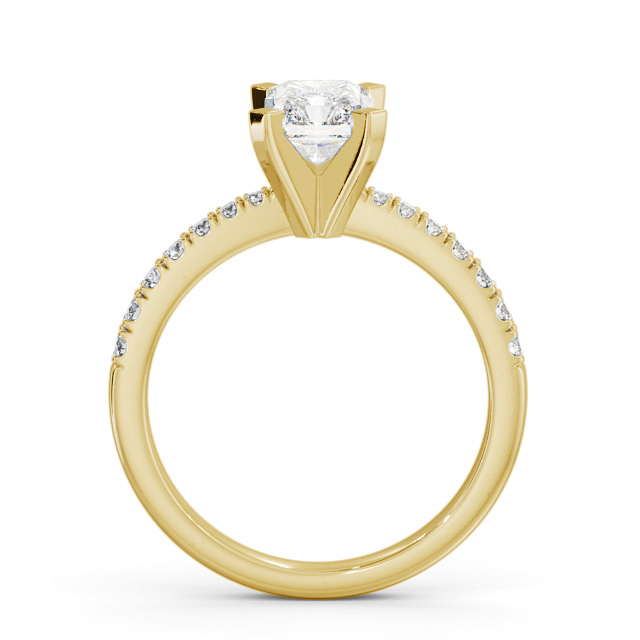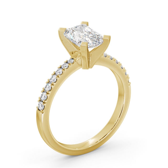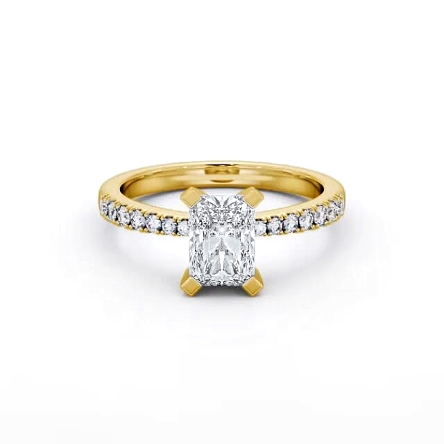 Emeline diamond engagement ring with a four claw 9K Yellow Gold setting. Stylish and unique, this beautiful ring is highlighted by a prong set radiant shaped centre diamond, peacefully sitting above a round diamond studded tapered band. Total diamond side stones weigh approximately 0.18ct with Clarity VS1 and Colour F. This ring is available in a range of metal options and your choice of natural or lab grown diamonds. We offer a free design service for any customised changes that you may require.