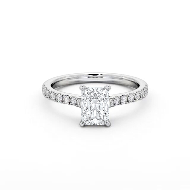 Azula diamond engagement ring with a four claw Platinum setting. A radiant shaped centre diamond is the focal point, and a highly polished band laced with petite round diamonds elevates the overall look of this ring. Total diamond side stones weigh approximately 0.25ct with Clarity VS1 and Colour F. This ring is available in a range of metal options and your choice of natural or lab grown diamonds. We offer a free design service for any customised changes that you may require.