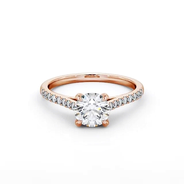Arina diamond engagement ring with a four claw 18K Rose Gold setting. Outstanding engagement ring, sparkling round diamonds lined band cleverly raise the centre round diamond for a wonderful appeal. Total diamond side stones weigh approximately 0.15ct with Clarity VS1 and Colour F. This ring is available in a range of metal options and your choice of natural or lab grown diamonds. We offer a free design service for any customised changes that you may require.